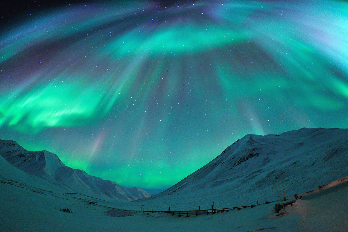 Световой спектр, в свою очередь, зависит от того, в какой слой атмосферы попал «солнечный ветер». Чаще всего мы видим световые столбы в нижних, более плотных, слоях атмосферы — там преобладают оттенки зеленого. А на большой высоте молекулы газа светятся красным. И как всегда, впечатление чертовски зависит от ракурса. Если смотреть прямо снизу, будет заметнее зеленый спектр. Тем, кто наблюдает издалека — проще увидеть верхнюю часть солнечного возмущения, именно поэтому на юге небеса чаще багровеют. Так что красное и розовое небо, доходящее до умеренных и южных широт — признак интенсивных магнитных бурь.
