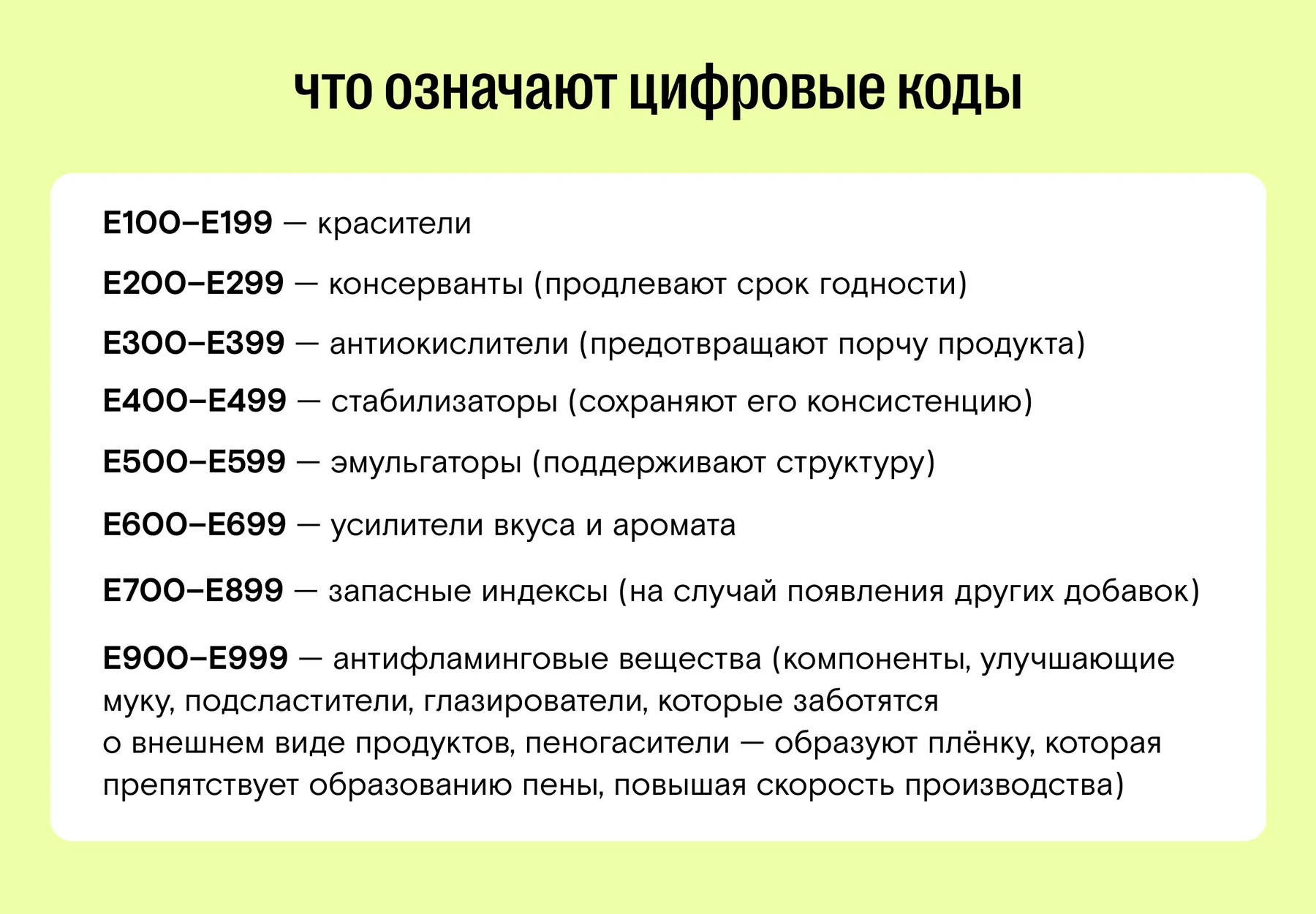 В составе популярных продуктов рядом с обычными словами мы видим непонятные коды, и это обоснованно настораживает. Чаще всего это пищевые добавки с Е-индексами. Пищевые добавки — вещества, которые добавляют в продукты в процессе производства, упаковки, транспортировки или хранения для придания им желаемых свойств. Буква Е означает, что это вещество входит в классификацию пищевых добавок в рамках Европейского сообщества (Е от слова Europe). А цифра обозначает категорию и номер добавки.